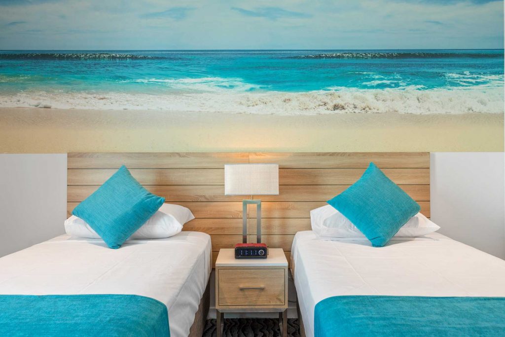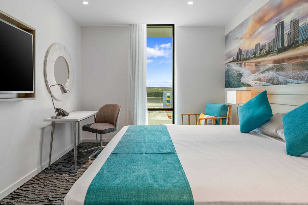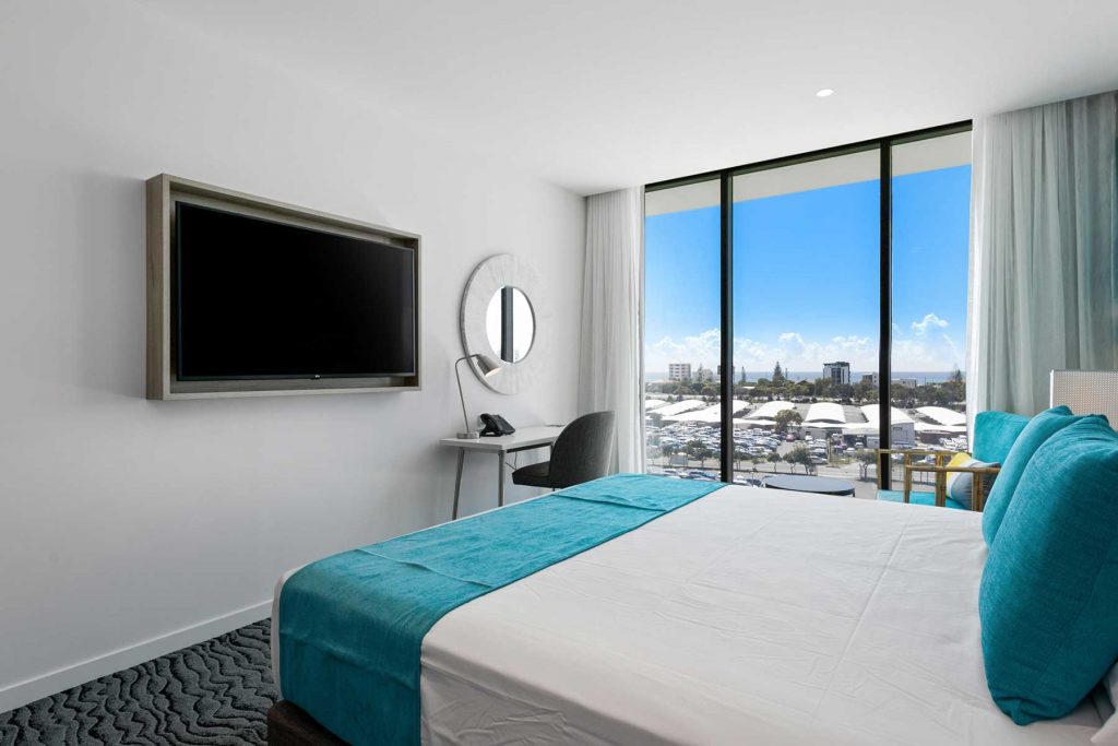 Tailored for friends, colleagues, or families, the Coastal Twin Room offers stunning ocean views with flexible sleeping arrangements. Two king single beds, a spacious layout, and full glass frontage bring in natural light and fresh sea breezes. Whether you’re catching an early flight or spending days exploring the Gold Coast, this room blends comfort, style, and relaxed beachside energy.